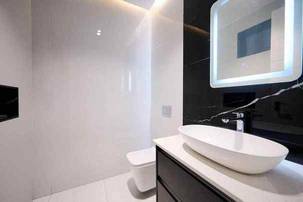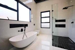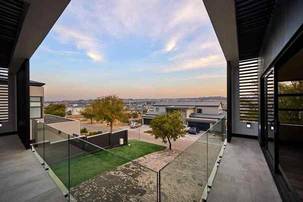 Upstairs, five en-suite bedrooms offer elevated serenity, all featuring high ceilings, built-in wardrobes, and large windows. Three open onto private balconies with sweeping views over Waterfall and Sandton. The luxurious primary suite includes a boutique-style walk-in dressing room, a freestanding bath, a double vanity with LED mirrors, and a walk-in rain shower—all finished in a palette of calming neutrals.