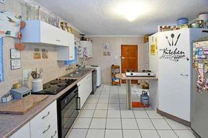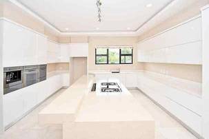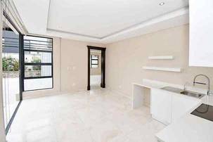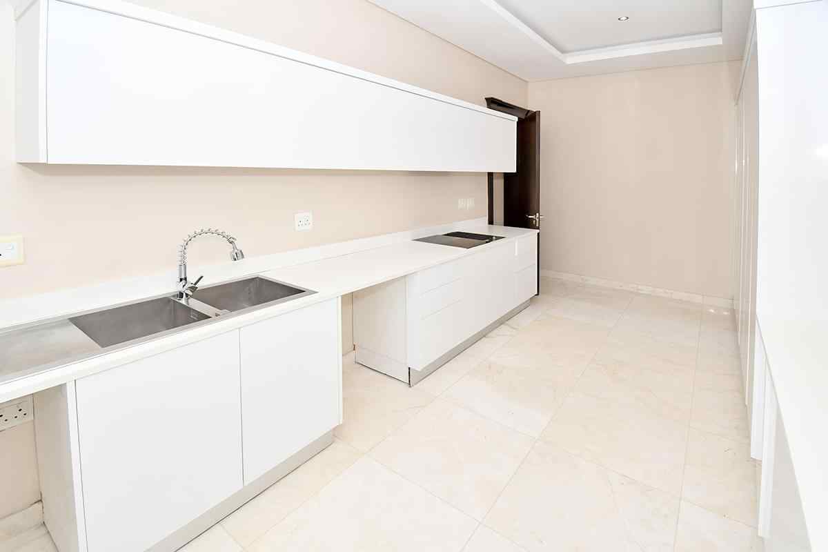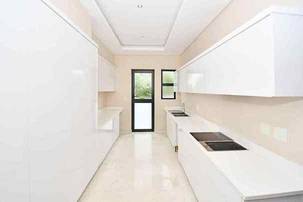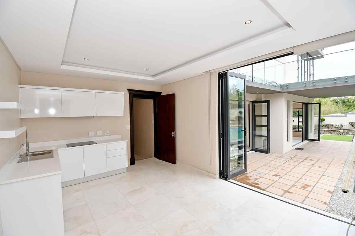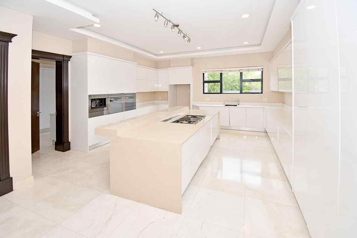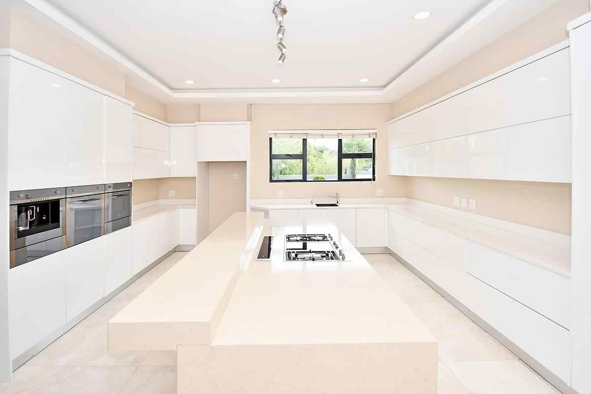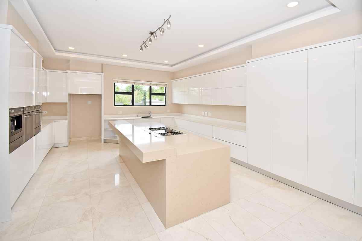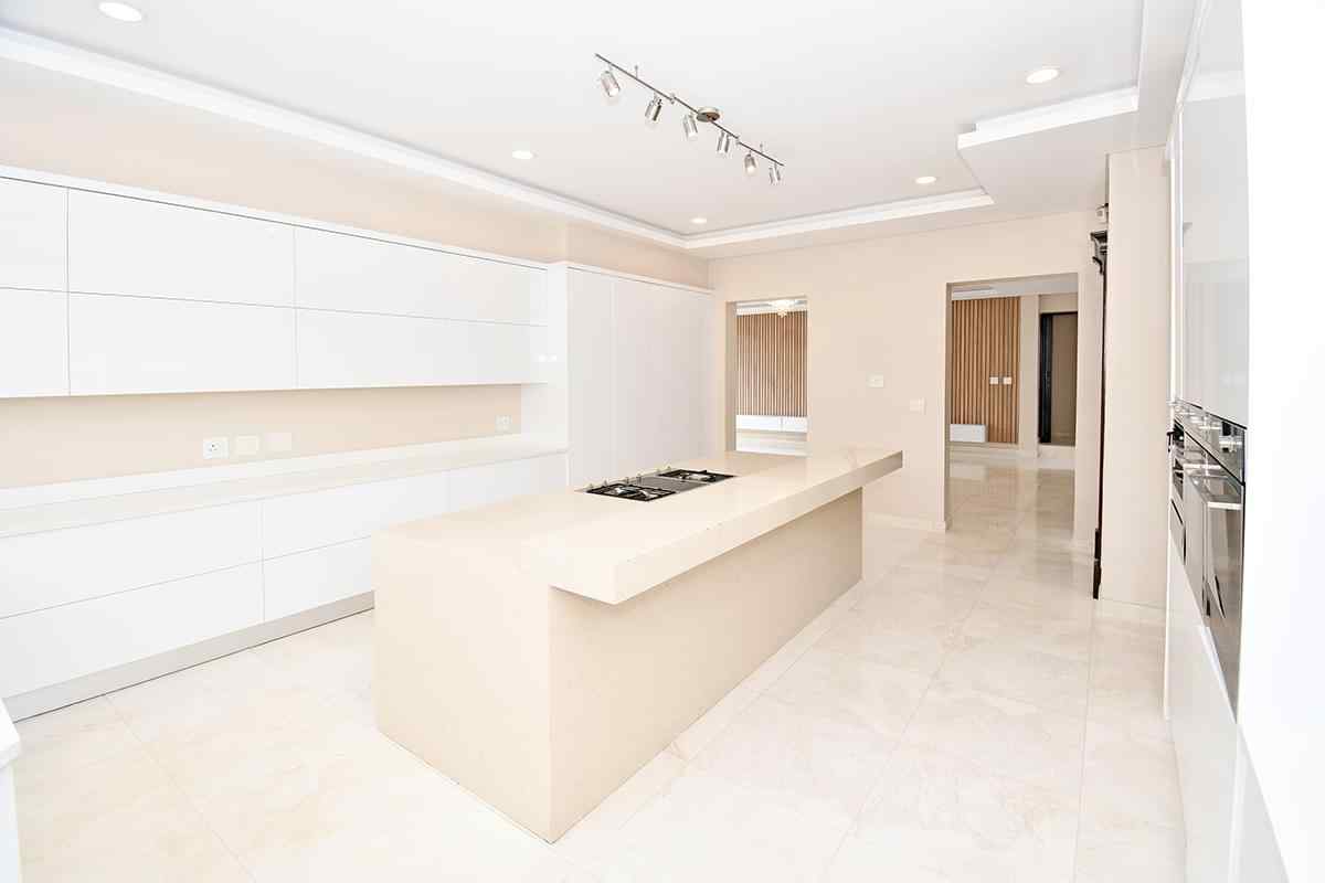 The designer kitchen is a showstopper — perfectly positioned at the heart of the home so that no one is left out of the fun while cooking or hosting. It features modern beige and sleek white cabinetry, a large stone-top island with breakfast bar, integrated SMEG appliances, and ample counter and storage space. A convenient scullery is tucked neatly to the side.
