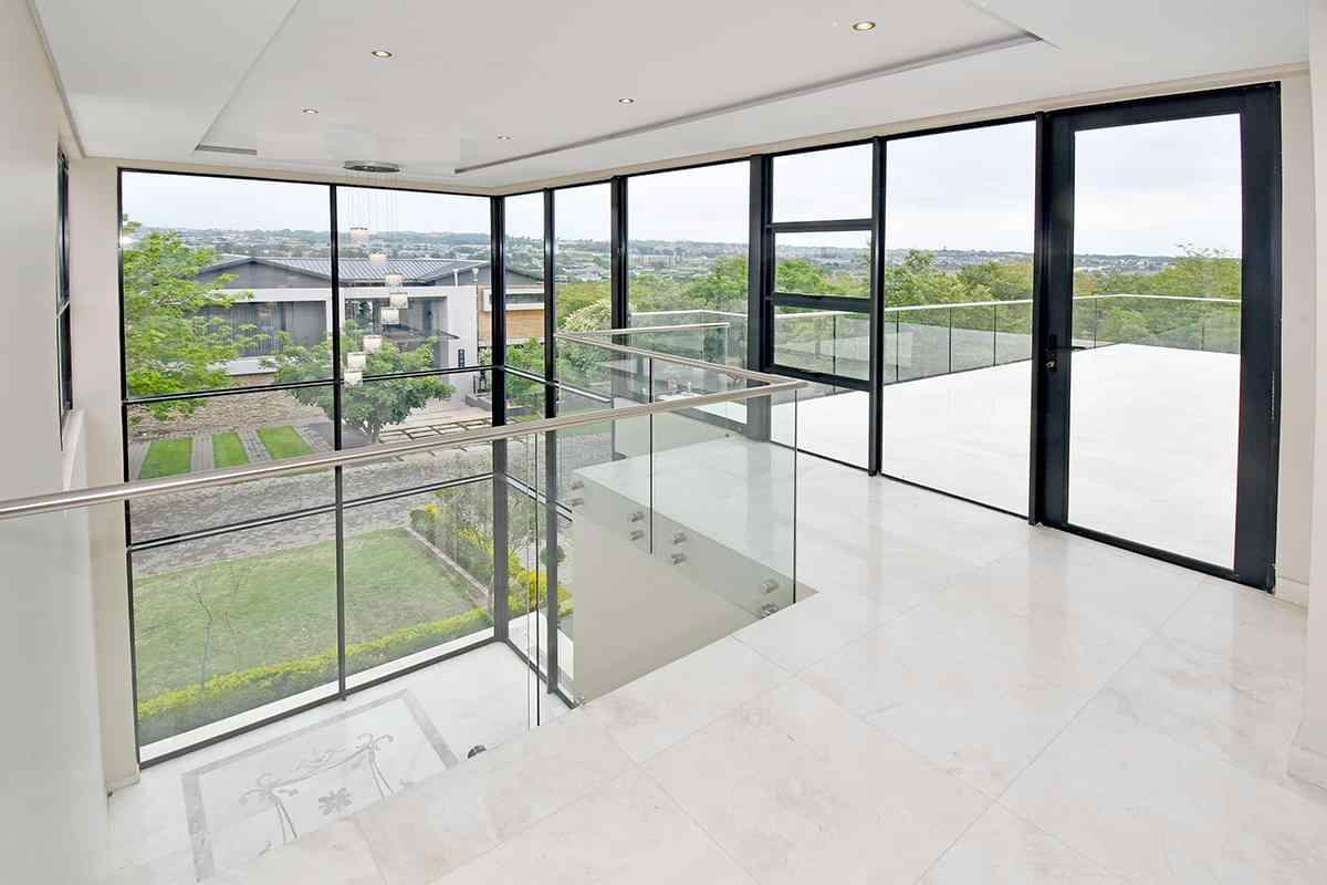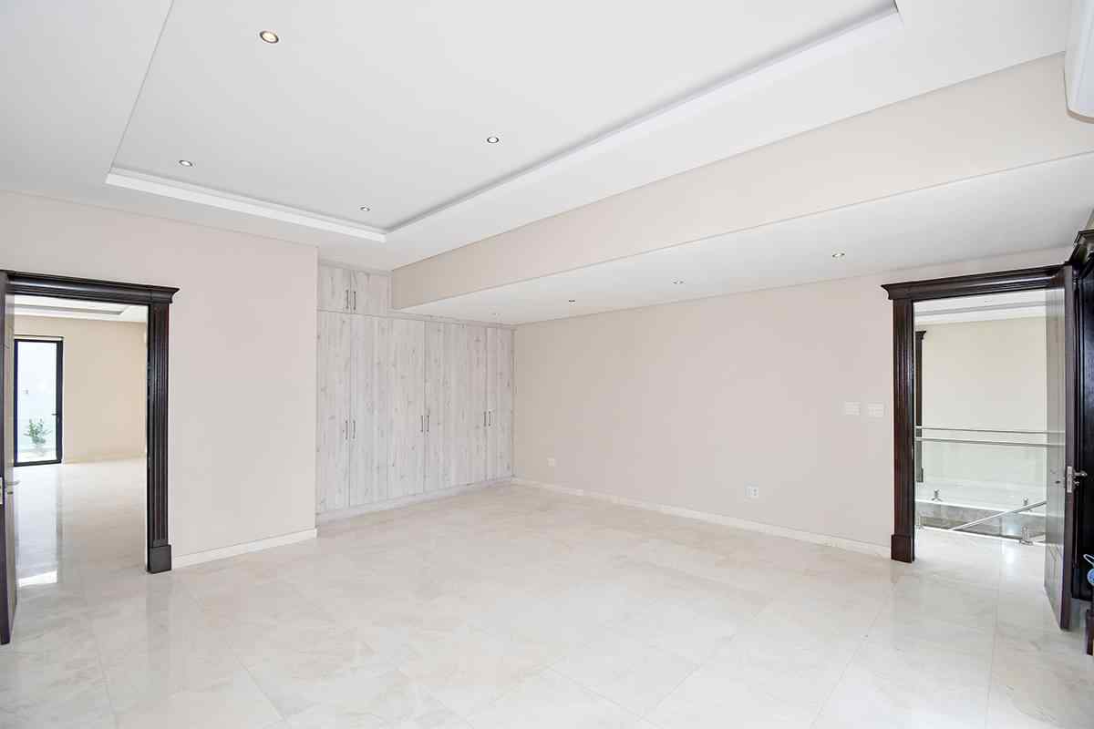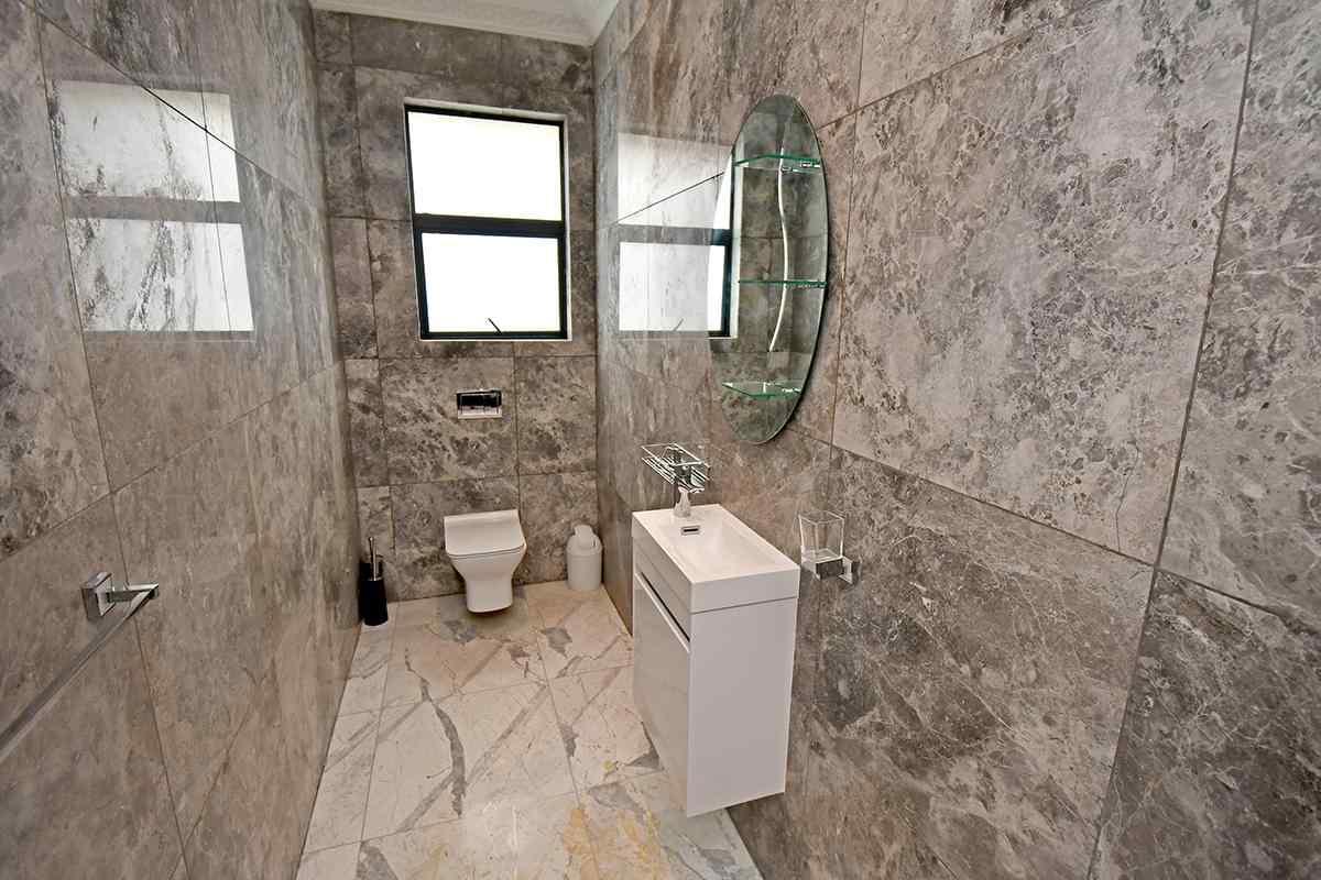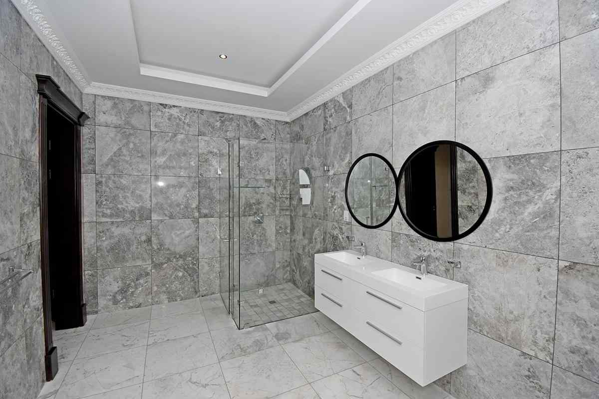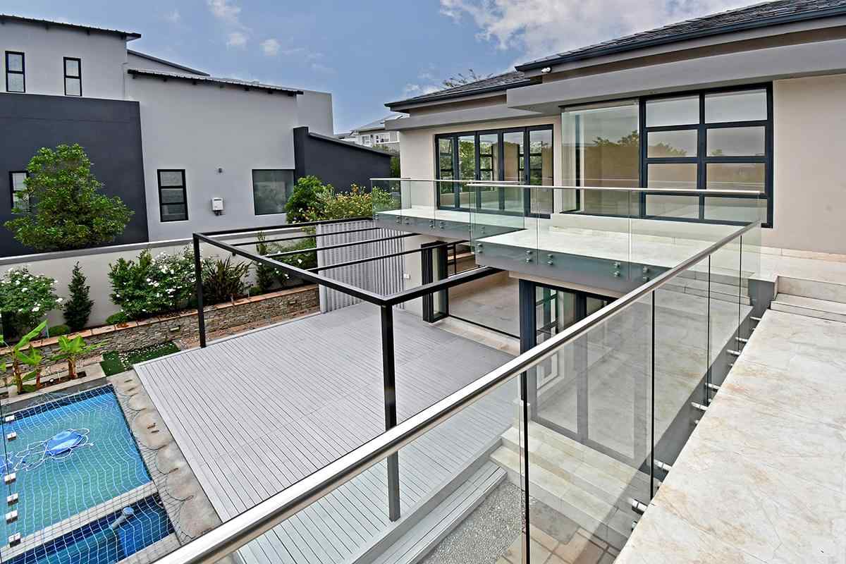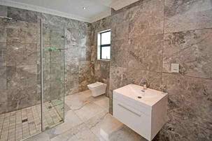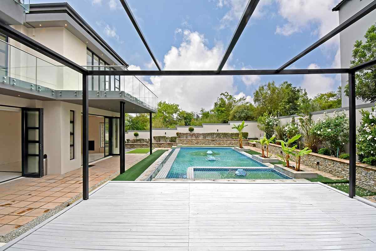 Ascending the beautifully crafted stone-tiled staircase to the upper level, you’ll find a spacious lounge area with travertine flooring and glass stacker doors opening to a large shared balcony overlooking the lush garden and pool below. The upper level houses five generous bedrooms, each with its own luxuriously appointed ensuite bathroom and built-in wardrobes. Some of the bedrooms also enjoy private balcony access with panoramic views of the Waterfall skyline. The Main bedroom is really spacious and boasts a walk-in wardrobe, balcony access through large glass stacker doors and a stunning full bathroom complete with a large shower and stand alone tub, perfect for those long hard days that require a long quiet soak in the tub.