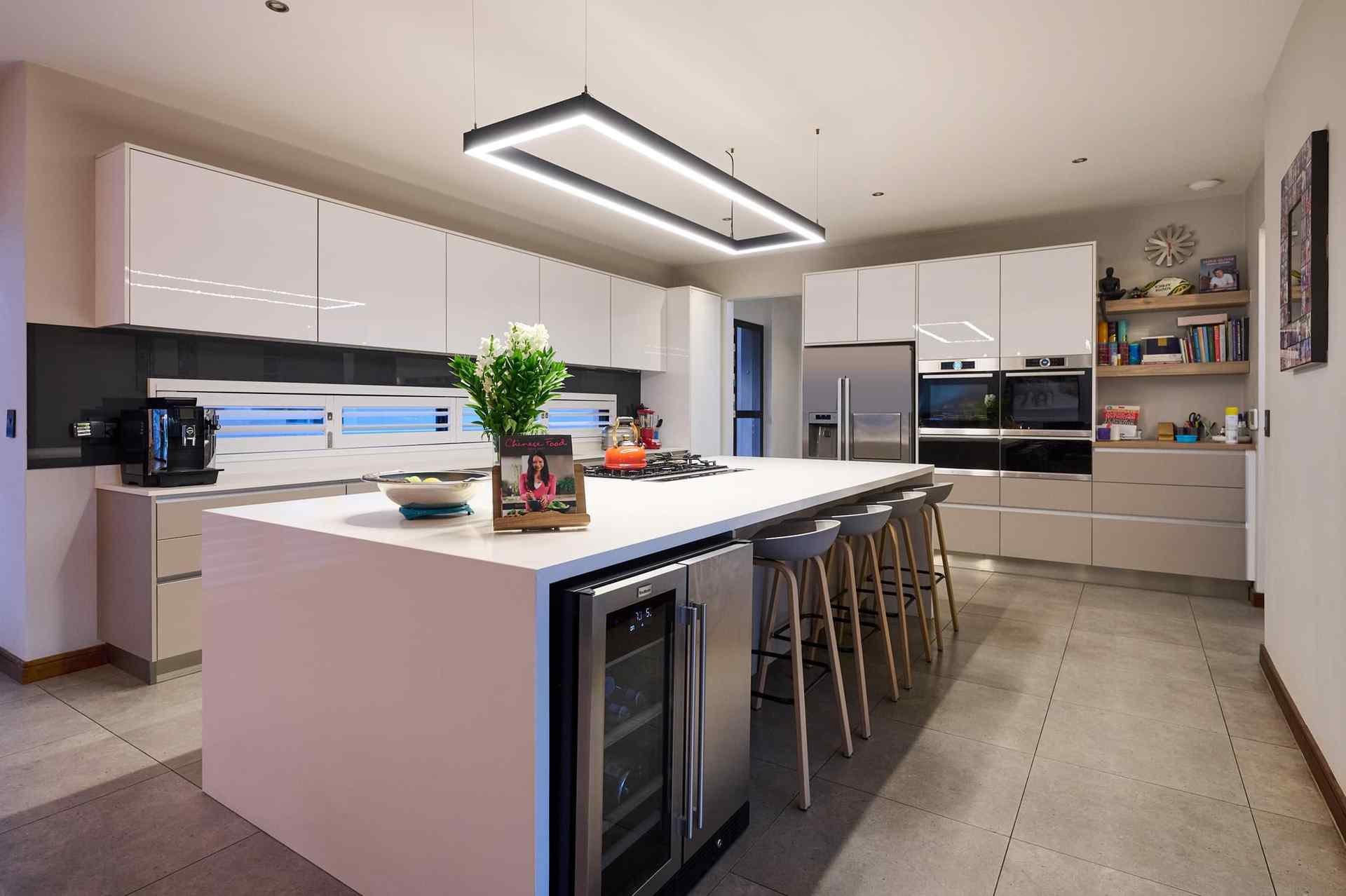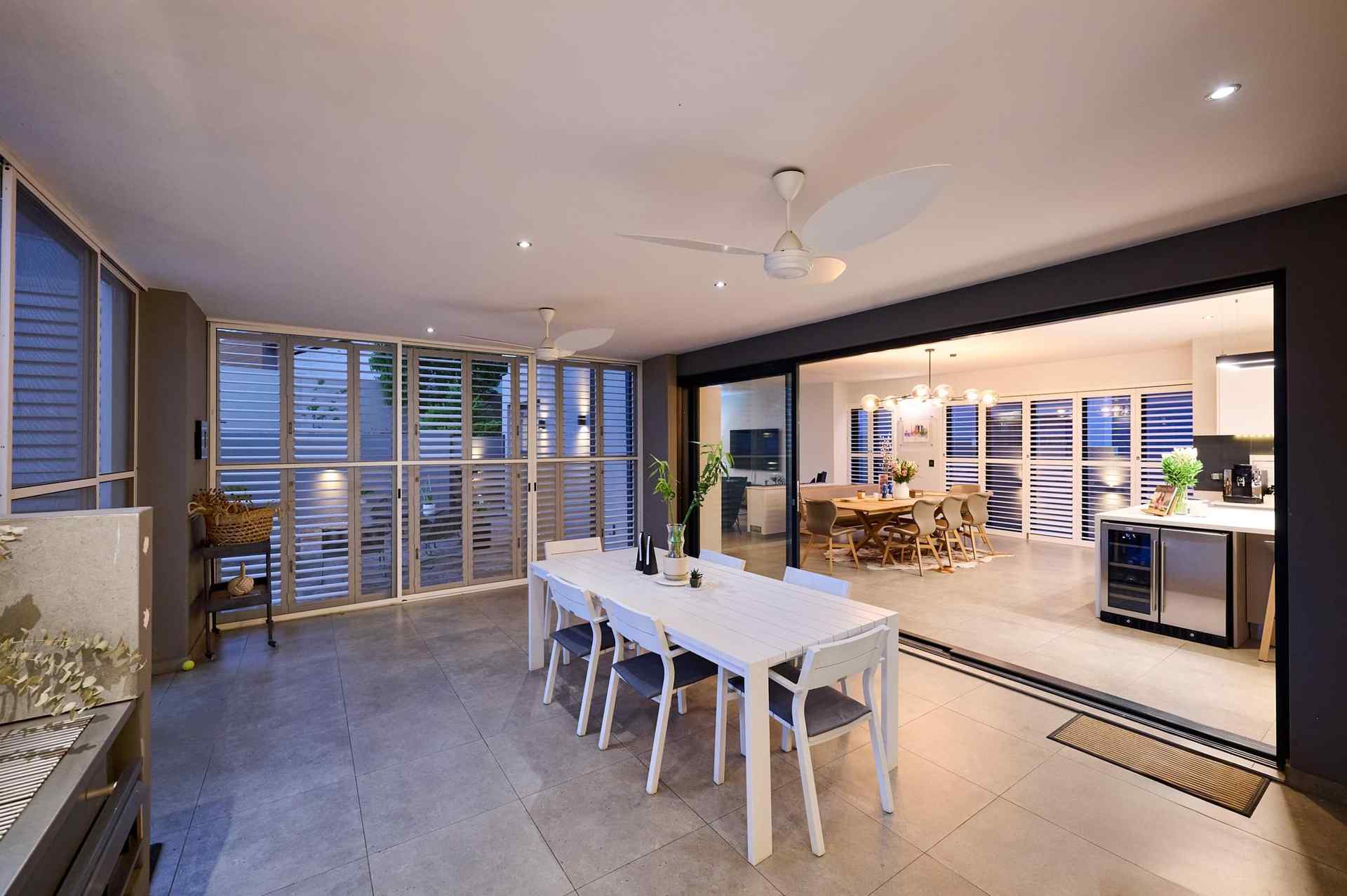 The Optima-designed kitchen dazzles with clean lines and clever lighting. Glossy white cabinetry pairs beautifully with pale grey undercounters, providing a smart and crisp look, centred around a Quartz-topped island with gas hob. Narrow windows at counter height continue the theme of natural light, while the separate scullery-laundry ensures practicality. Overlooking the dining area, both spaces connect to the enclosed patio through wide sliding doors – perfect for year-round entertaining. The air-conditioned TV lounge is warm and inviting, featuring a flueless infinity-style gas fireplace that subtly defines the space.