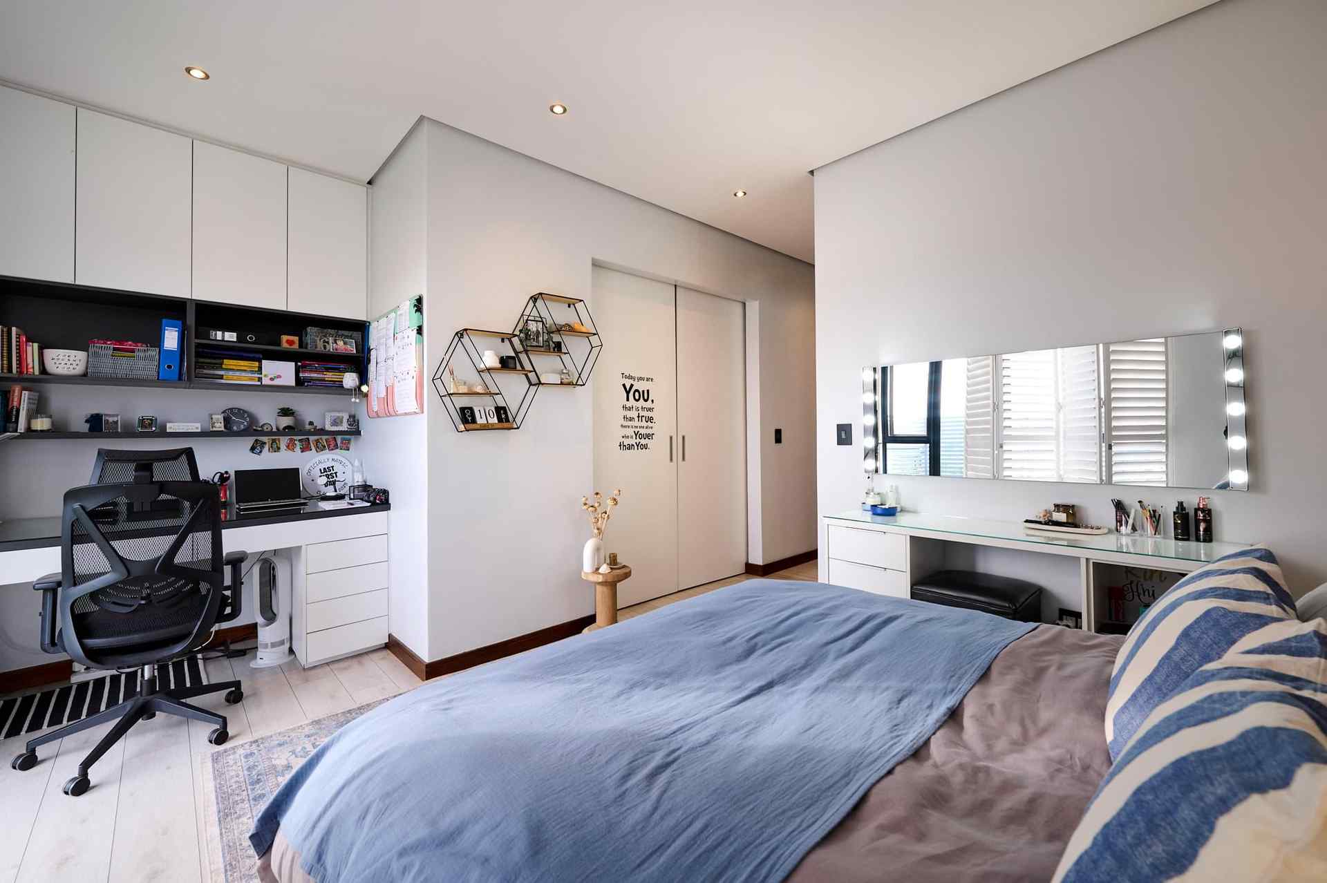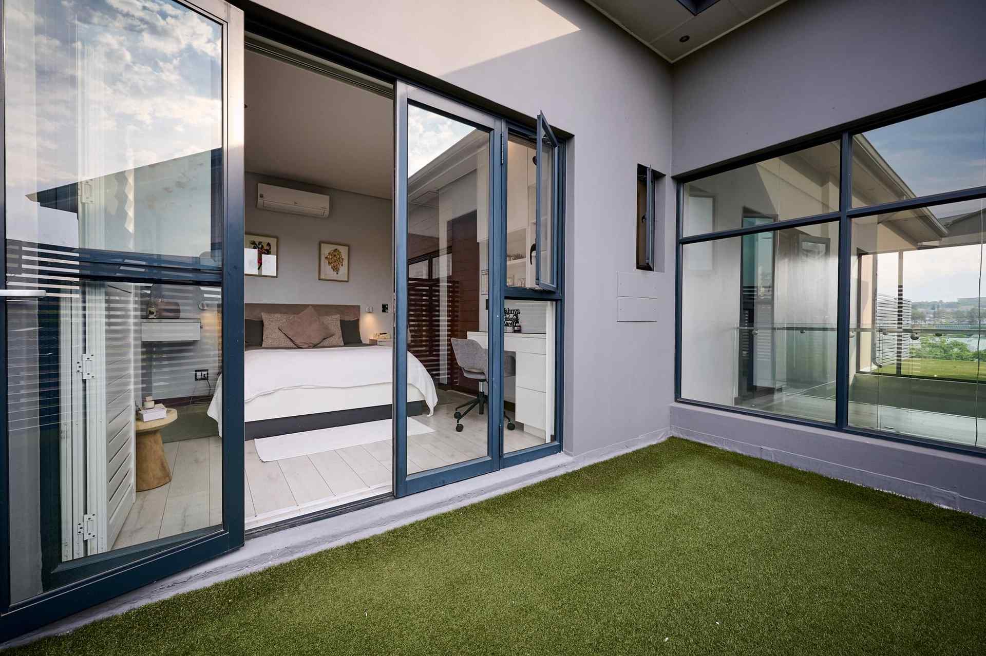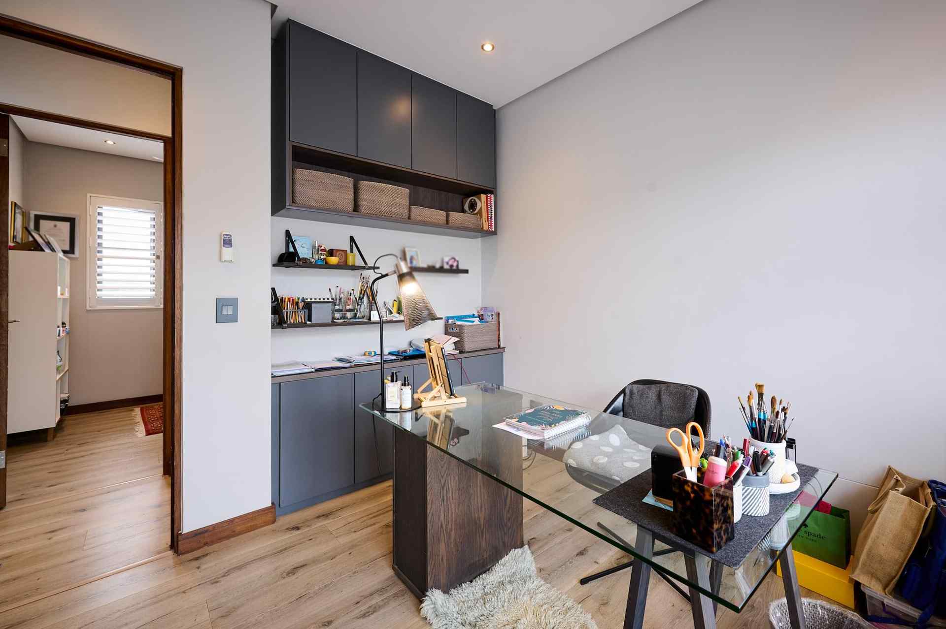 The patio includes a built-in gas braai and prep area that echoes the kitchen’s stylish design. Merging with the outdoors, this relaxing space features overhead fans and mosquito screens. The inviting Moroccan blue pool is set amongst the landscaped garden with automated irrigation for the well-established fruit trees, vegetables, and lush lawn. A luxurious guest suite completes the downstairs level, offering a private retreat with a lovely en-suite shower and stacking doors opening directly to the pool and garden.