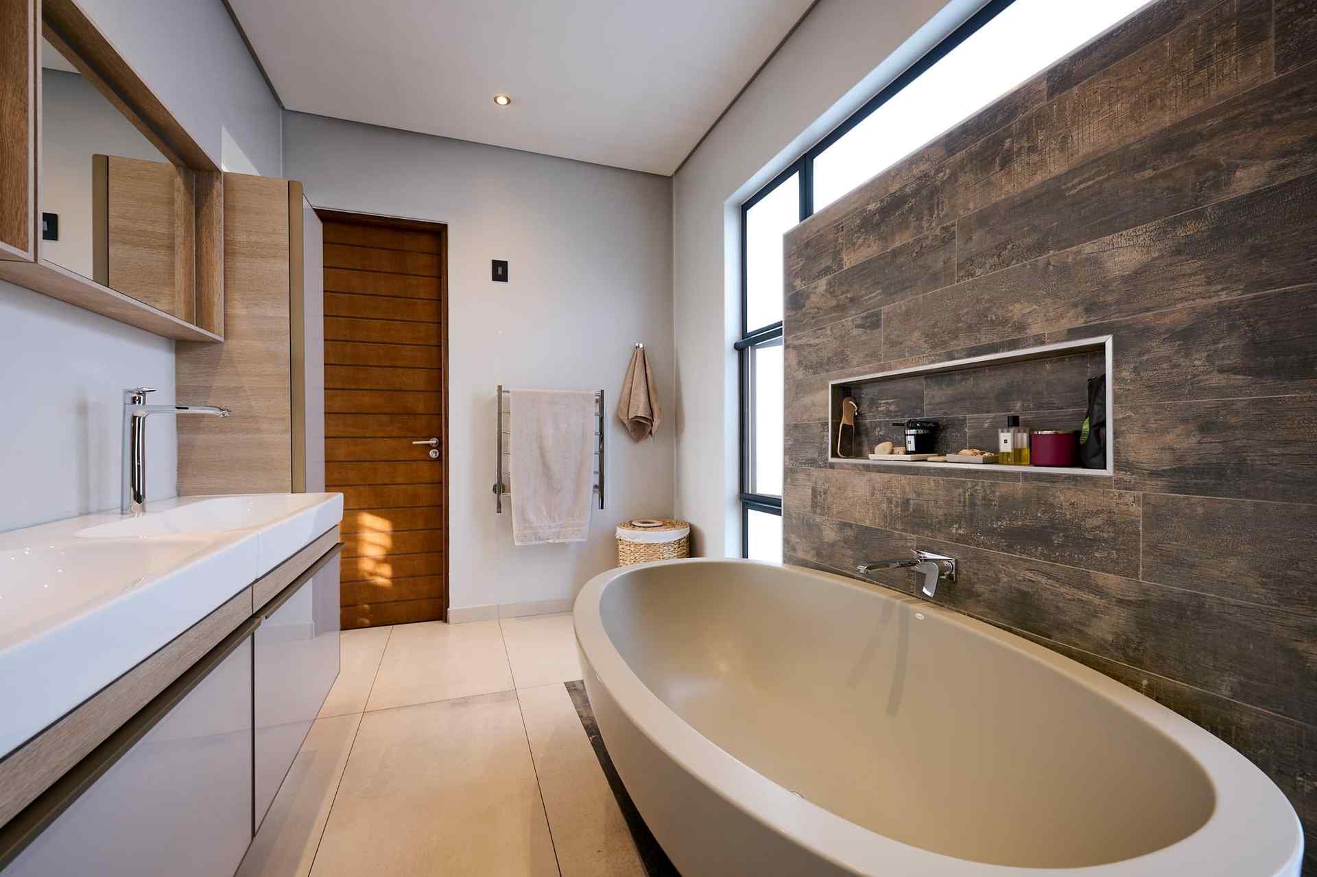 Upstairs, a spacious pyjama lounge with a coffee station overlooks both the garden and the Waterfall Valley. Two generous family bedrooms each enjoy a balcony, built-in desks, ample wardrobes, and elegant en-suite bathrooms–one with shower, the other a full suite–complete with heated towel rails and contemporary finishes. The main suite features a fireplace, and like the other bedrooms, air conditioning, and pale oak vinyl flooring. The walk-in dressing room is divine, alongside the impressive en-suite, with freestanding oval tub, twin vanities, and a spacious shower. Completing the upper level are His and Her studies, ideal for work-from-home or creative pursuits, both with overhead fans for air circulation.