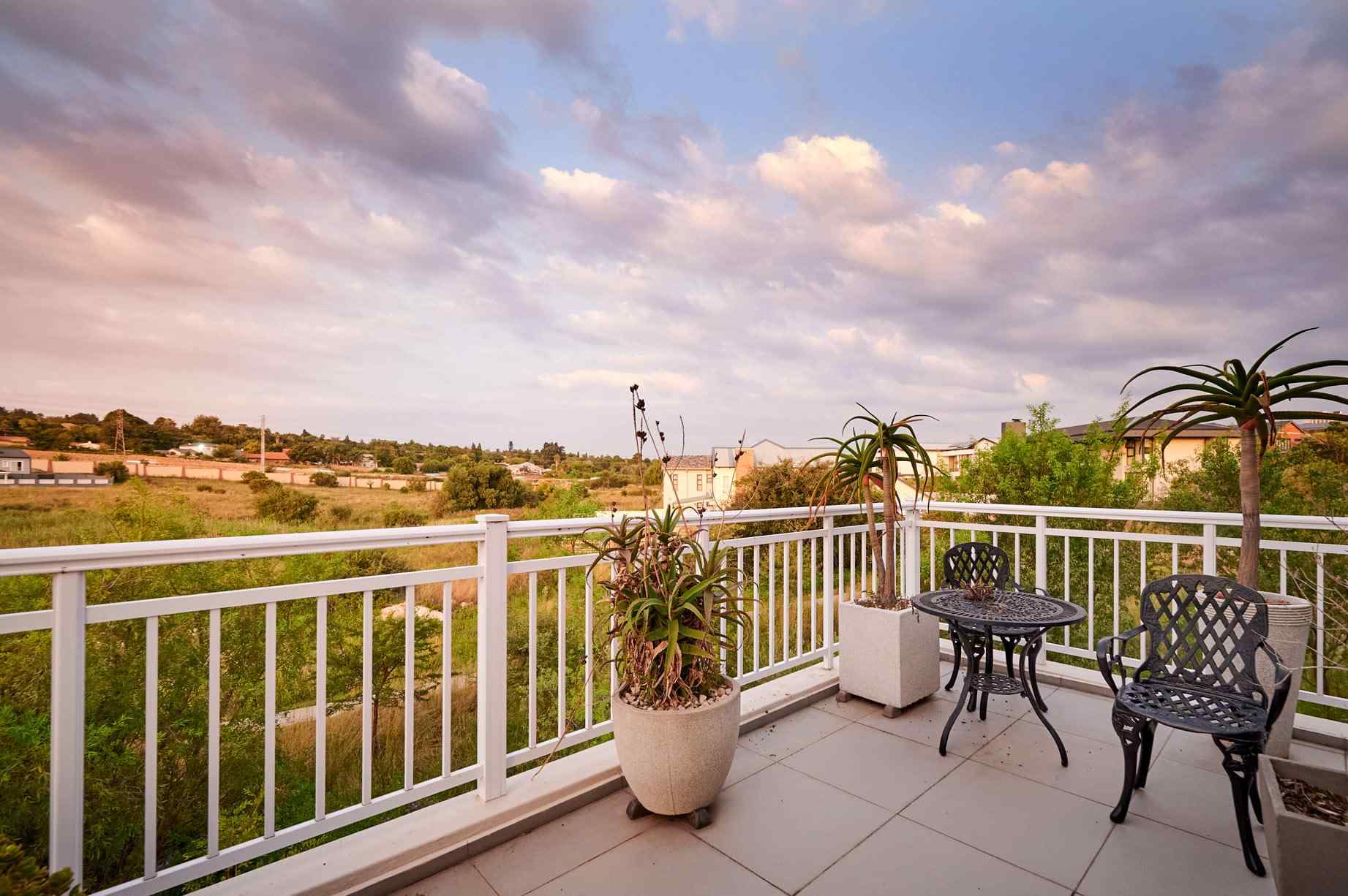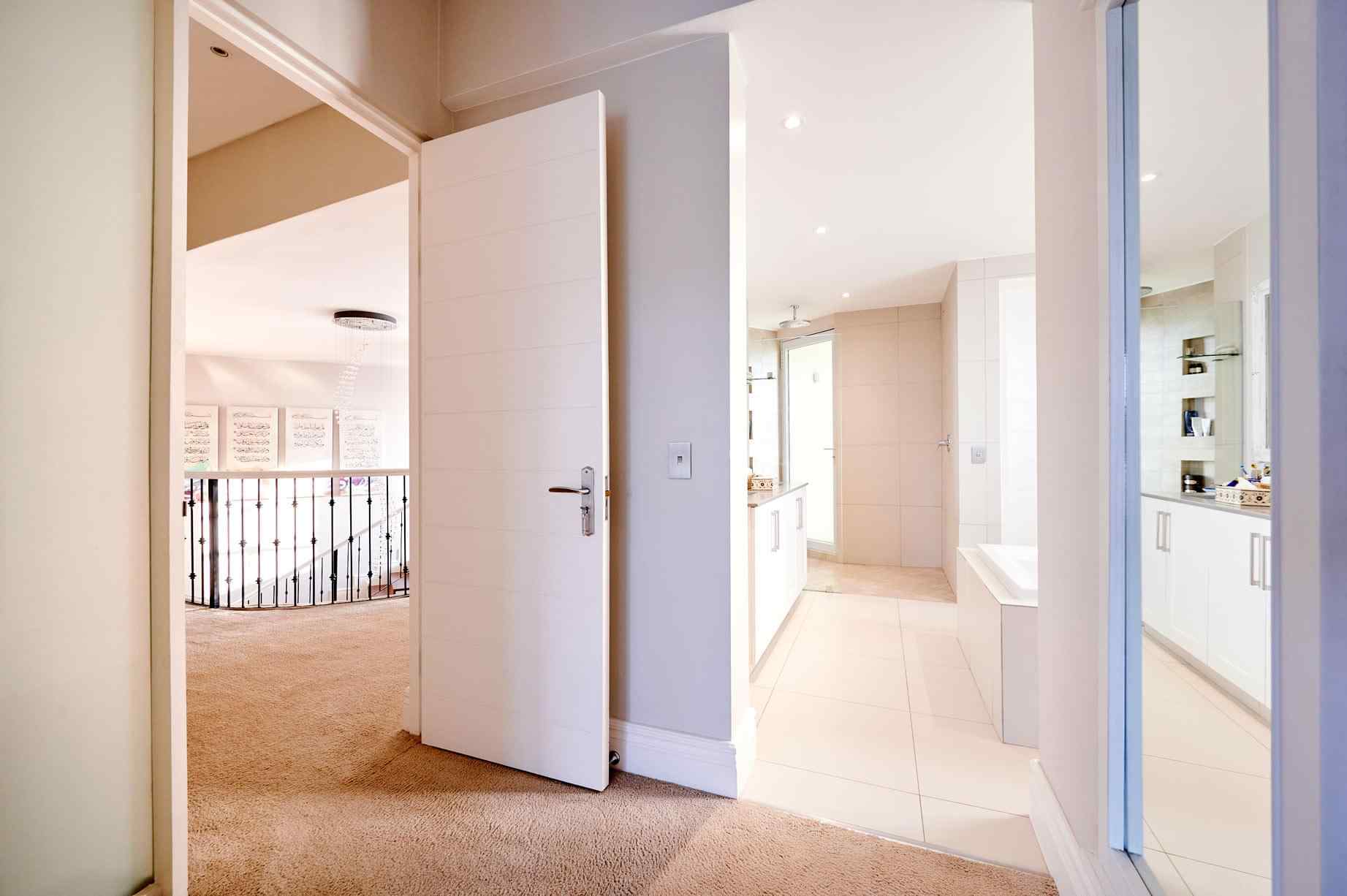 En route to the rooms on the first floor, a mezzanine level houses the study, complete with built-in cupboards, shelving and a desk. Plush carpeting provides a luxurious feel in this space, as well as in the bedrooms. The master suite is spacious, with a lounge area and doors that open to a large wraparound balcony. A walk-in dressing room is alongside the large bathroom, with a jet spa bath and a shower that opens to the outdoors, for the fresh air experience. Two more bedrooms share a full bathroom and overlook the garden.