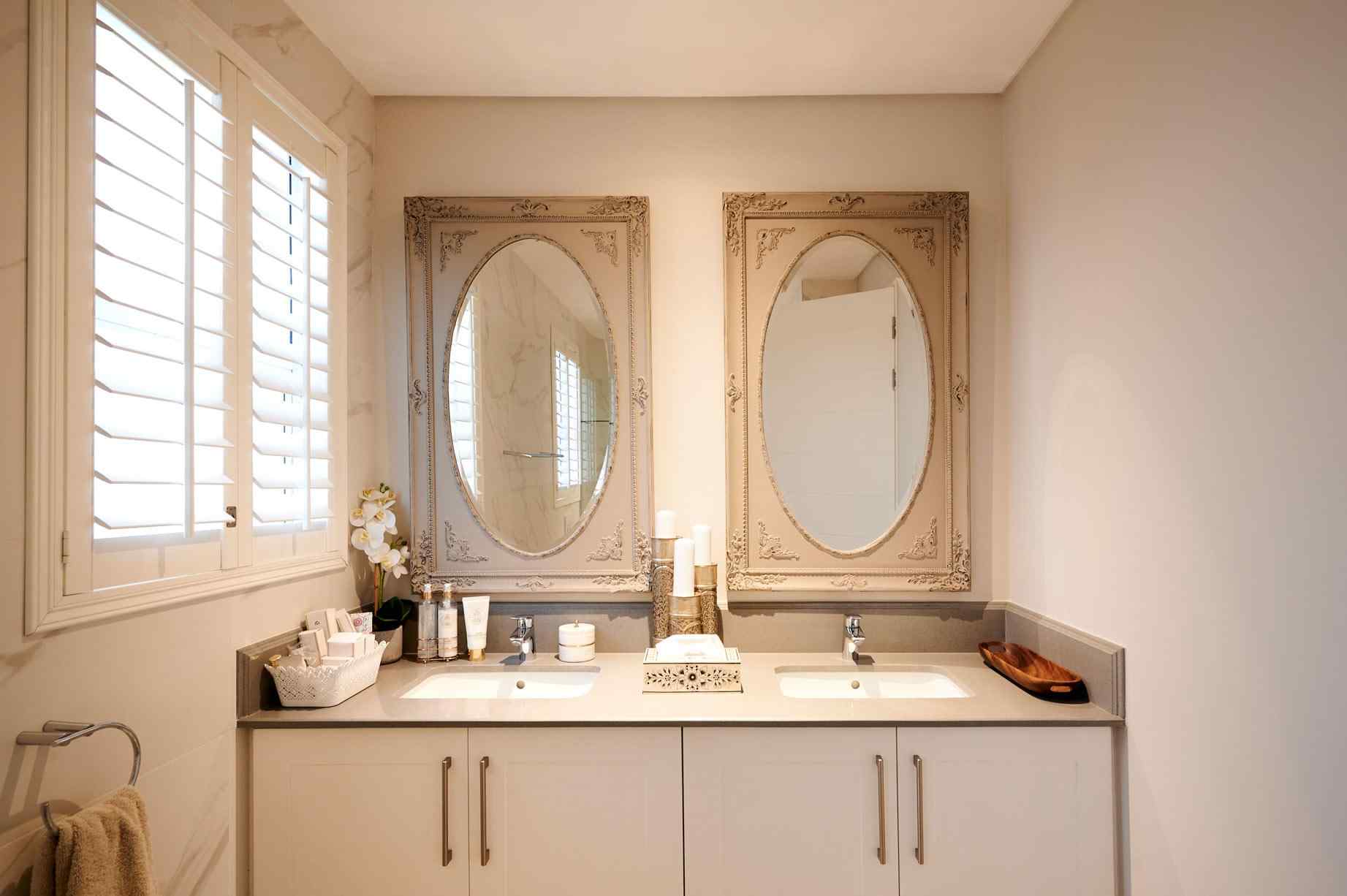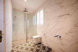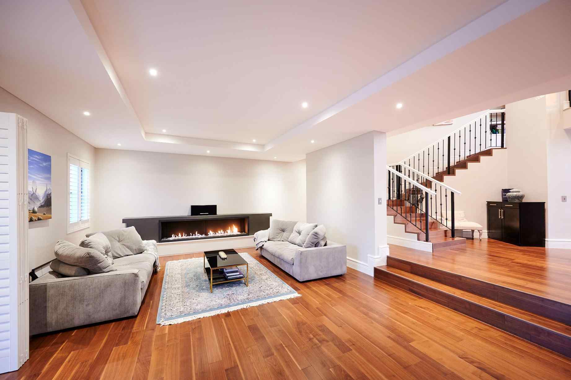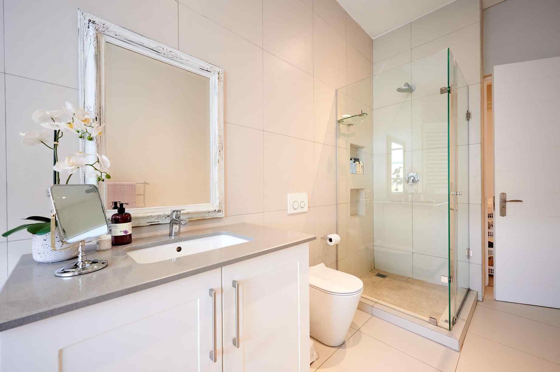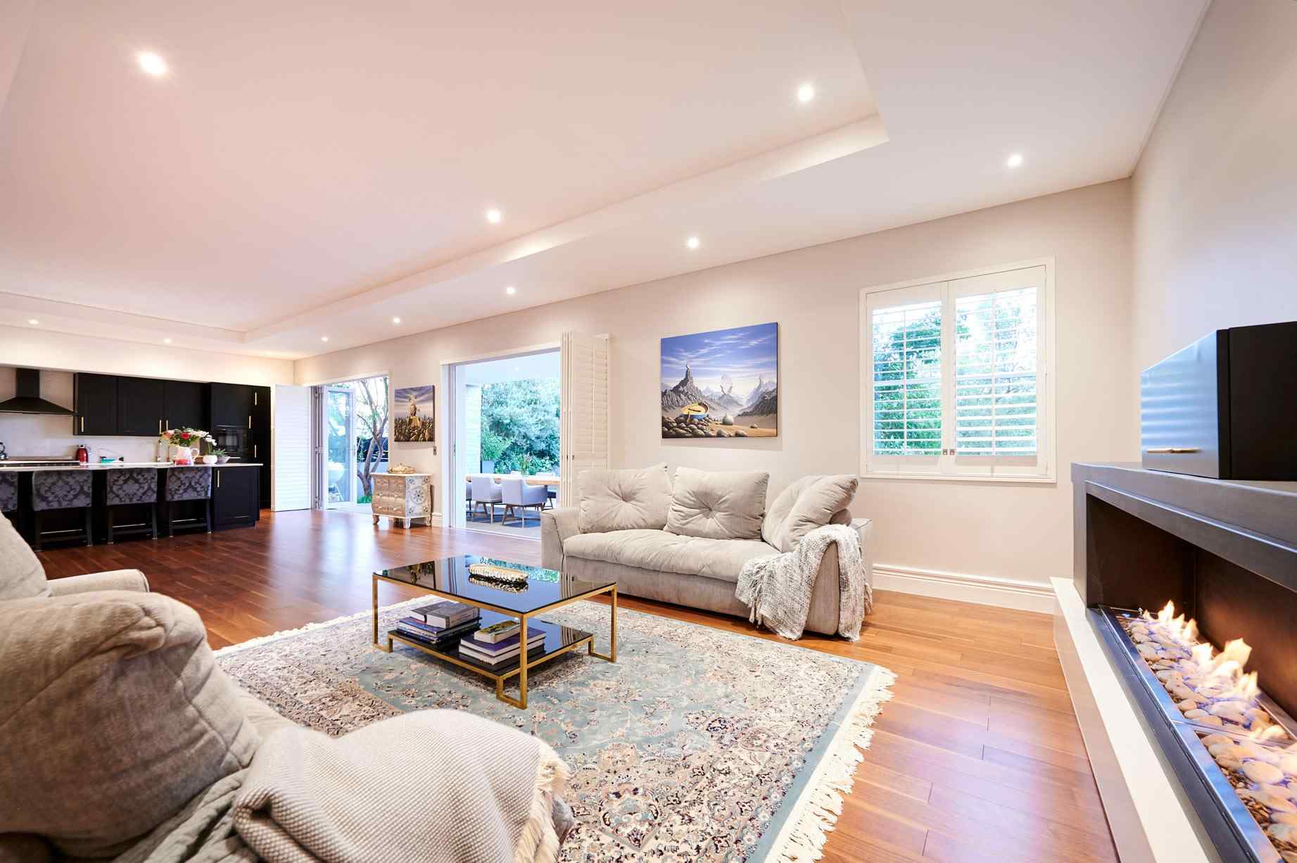 The lounge area features a double flueless gas fireplace, set into the wall unit. Tucked behind the lounge is the guest suite, a well-appointed space including a separate bathroom and lounge, with its own private patio. The shower features a ceiling mounted rain flow shower head and high-end finishes, a trend that continues through to the other bathrooms.