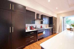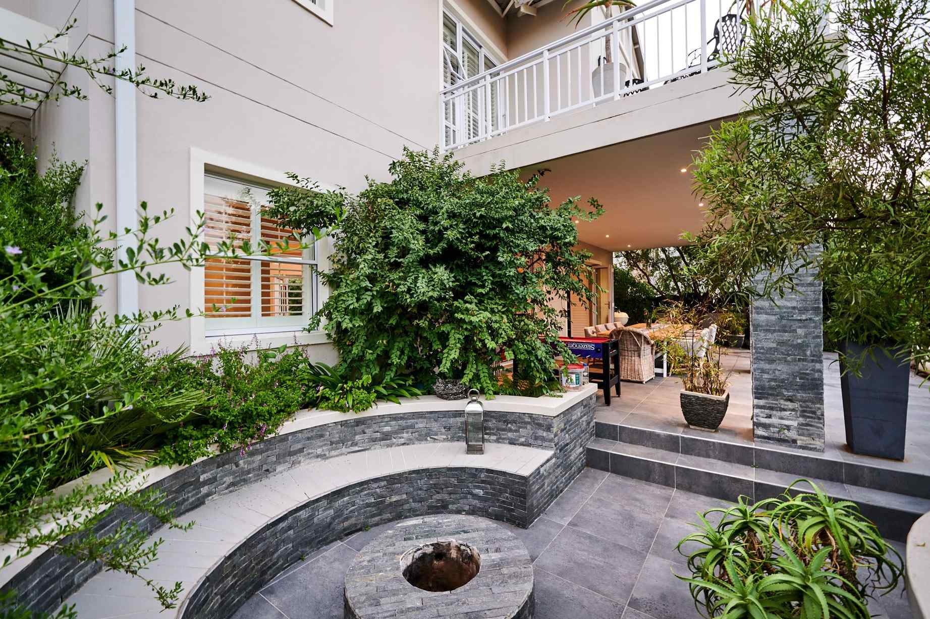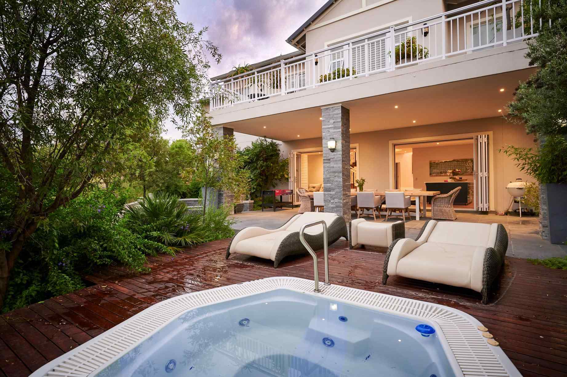 The patio, connected to the garden by curving walls and a lovely garden, overlooks a heated jacuzzi, with deck surround. With no fence or high walls between the garden and greenbelt, the jacuzzi experience is a true city escape. Wandering through the garden down the side of the house past a fire pit, a small en-suite room has separate access, echoing the design and décor of the rest of the house.