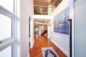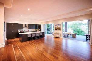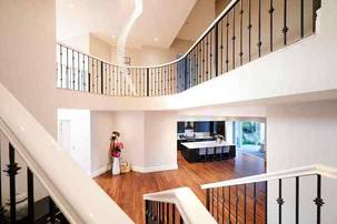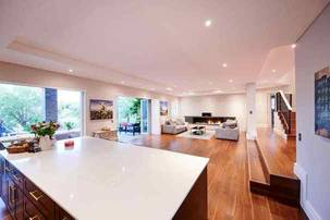 A decked pathway to the left of the double garage leads to the double volume entrance, suffused with natural light. Two elegant crystal chandeliers set the tone, positioned above the curving staircase. Down a few steps into the vast open plan kitchen and lounge area, stacking doors bring the flow onto the covered patio, with views across the greenbelt. The kitchen, clean and crisp with white cupboards, SMEG appliances and stone countertops, has a central island with breakfast counter, and a separate scullery leading to the yard.